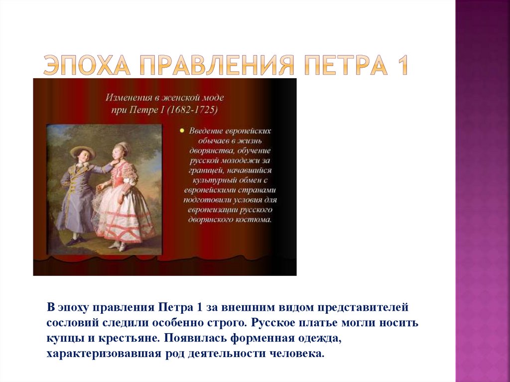 В эпоху правления Петра 1 за внешним видом представителейсословий следили особенно строго. Русское платье могли носить