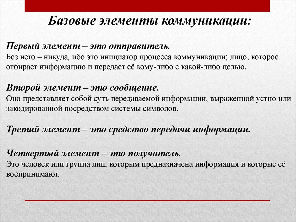 Базовые элементы коммуникации:Первый элемент – это отправитель.