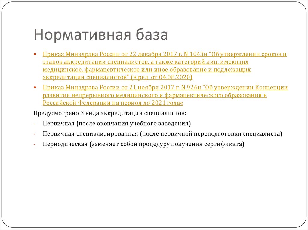 Нормативная базаПриказ Минздрава России от 22 декабря 2017 г. N 1043н "Об утверждении сроков и