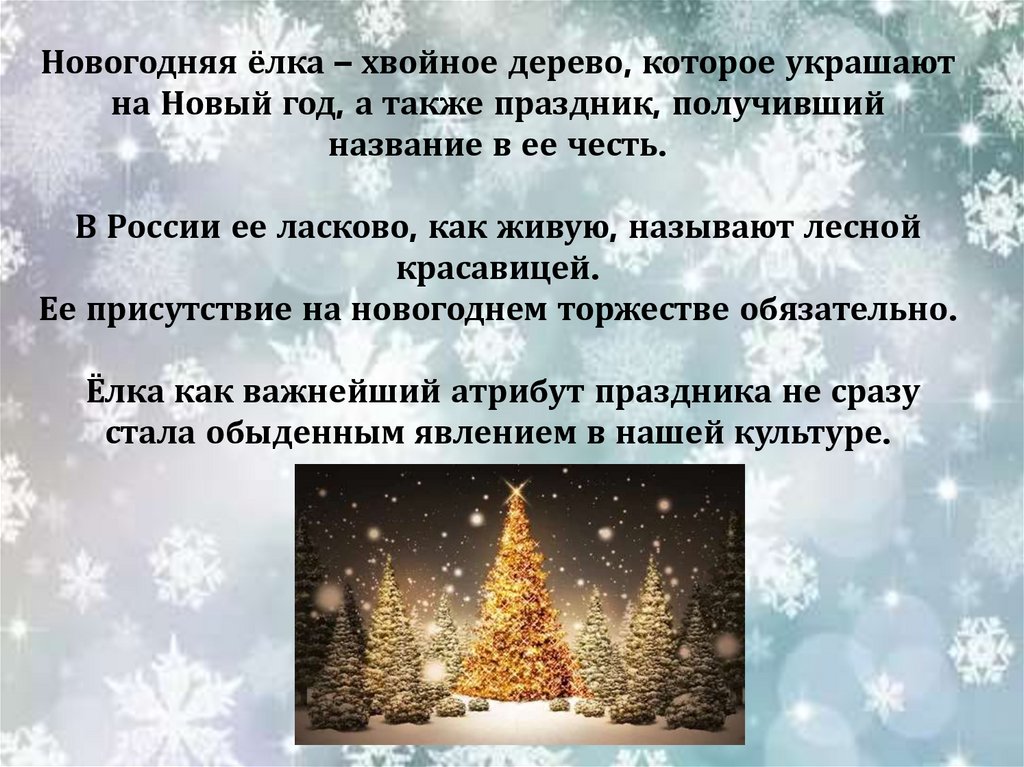 Новогодняя ёлка – хвойное дерево, которое украшаютна Новый год, а также праздник, получивший
