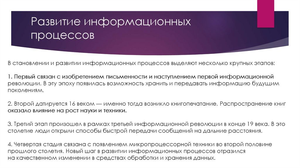 В становлении и развитии информационных процессов выделяют несколько крупных этапов: