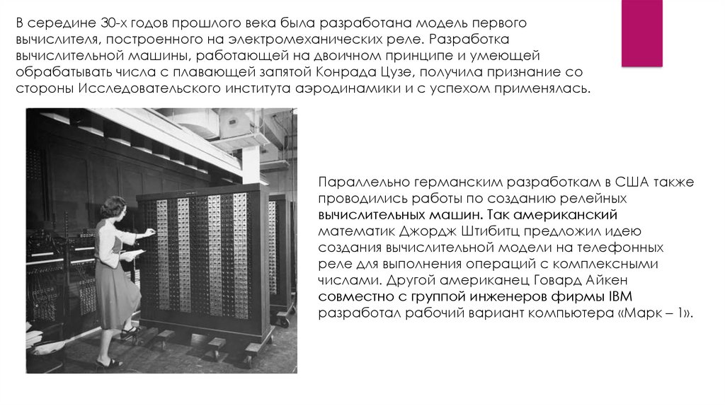 В середине 30-х годов прошлого века была разработана модель первоговычислителя, построенного на электромеханических реле. Разработка