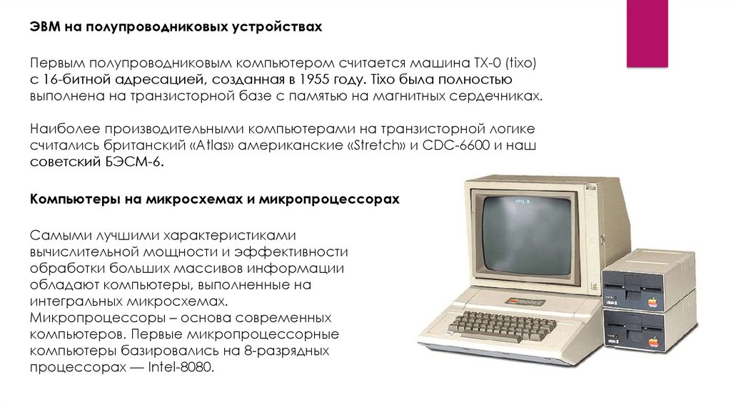 ЭВМ на полупроводниковых устройствахПервым полупроводниковым компьютером считается машина TX-0 (tixo)