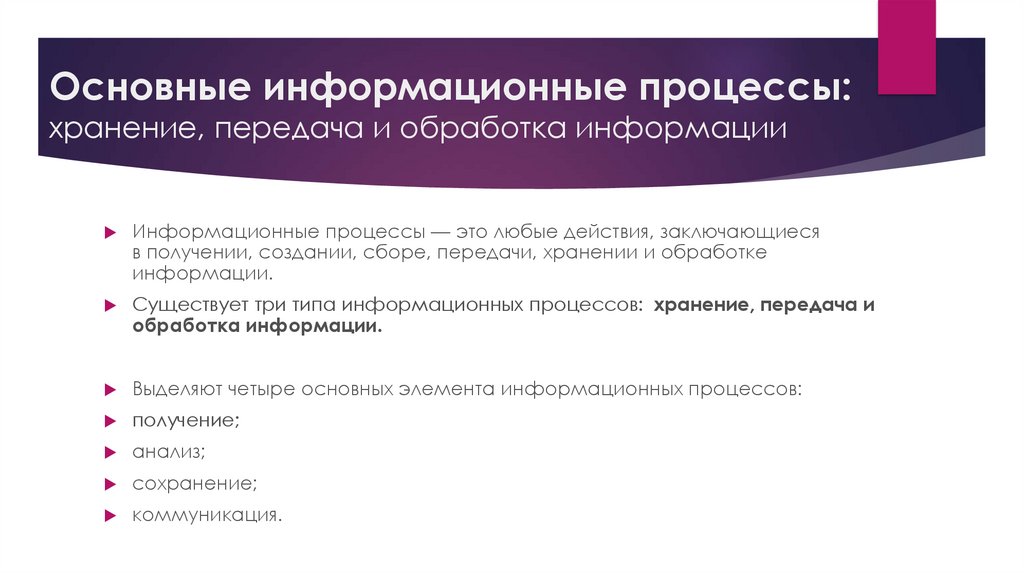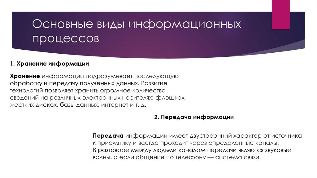 Существует три типа информационных процессов: хранение, передача и
