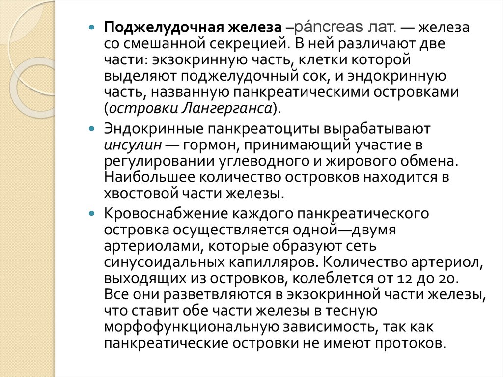 Поджелудочная железа –páncreas лат. — железасо смешанной секрецией. В ней различают две
