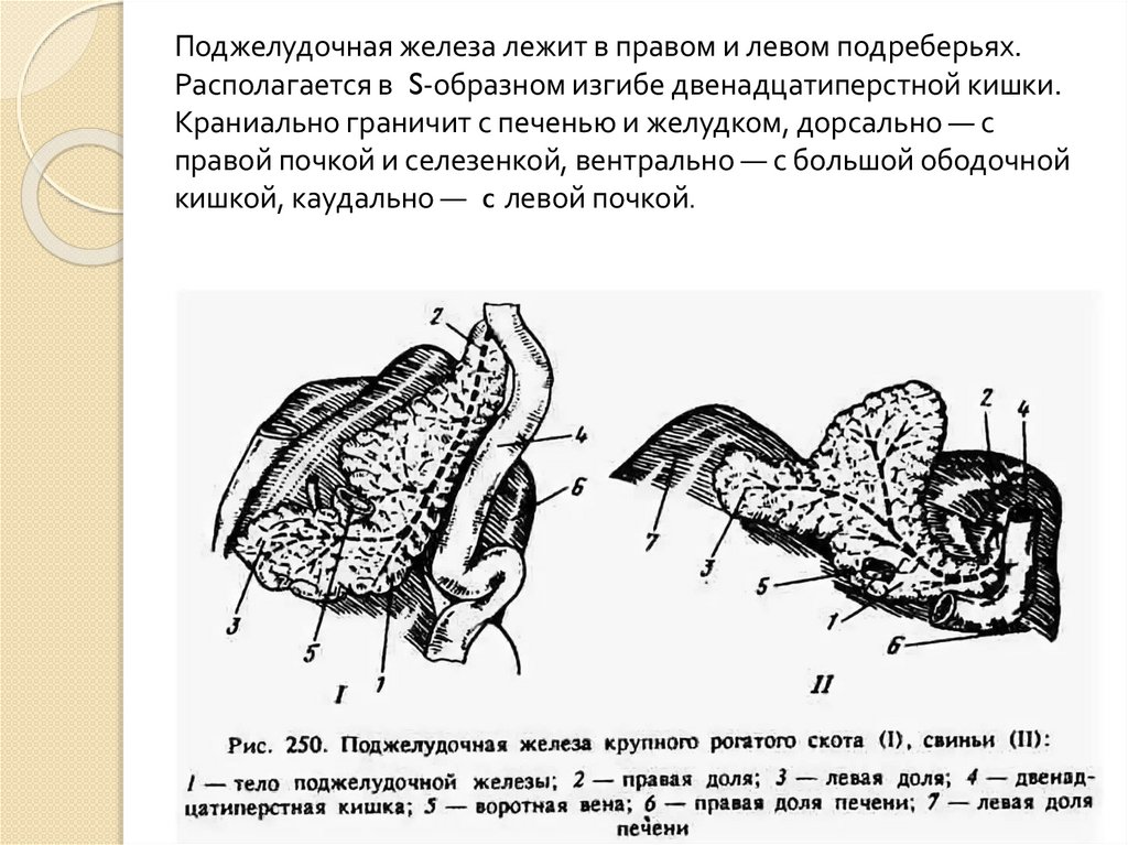 Поджелудочная железа лежит в правом и левом подреберьях.Располагается в S-образном изгибе двенадцатиперстной кишки.