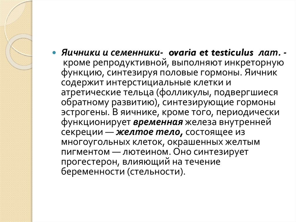 Яичники и семенники- ovaria et testiculus лат. кроме репродуктивной, выполняют инкреторнуюфункцию, синтезируя половые гормоны. Яичник
