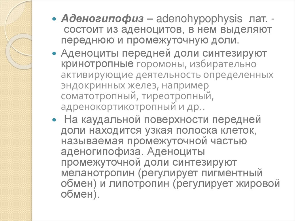 Аденогипофиз – adenohypophysis лат. состоит из аденоцитов, в нем выделяютпереднюю и промежуточную доли.