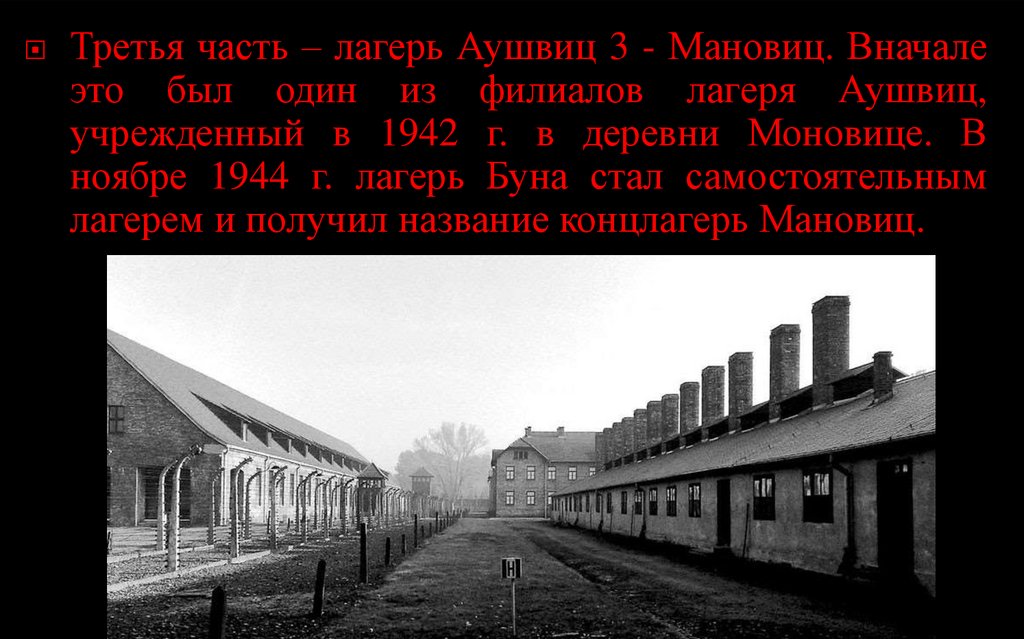 Третья часть – лагерь Аушвиц 3 - Мановиц. Вначалеэто был один из филиалов лагеря Аушвиц,