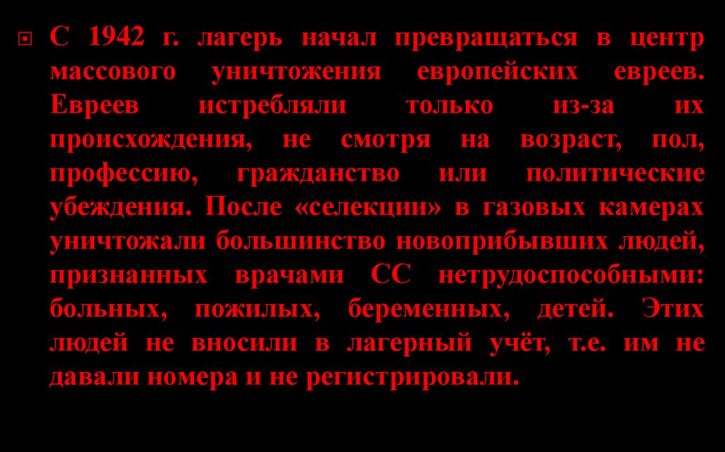 С 1942 г. лагерь начал превращаться в центрмассового уничтожения европейских евреев.