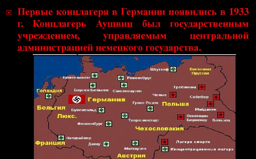 Первые концлагеря в Германии появились в 1933г. Концлагерь Аушвиц был государственным