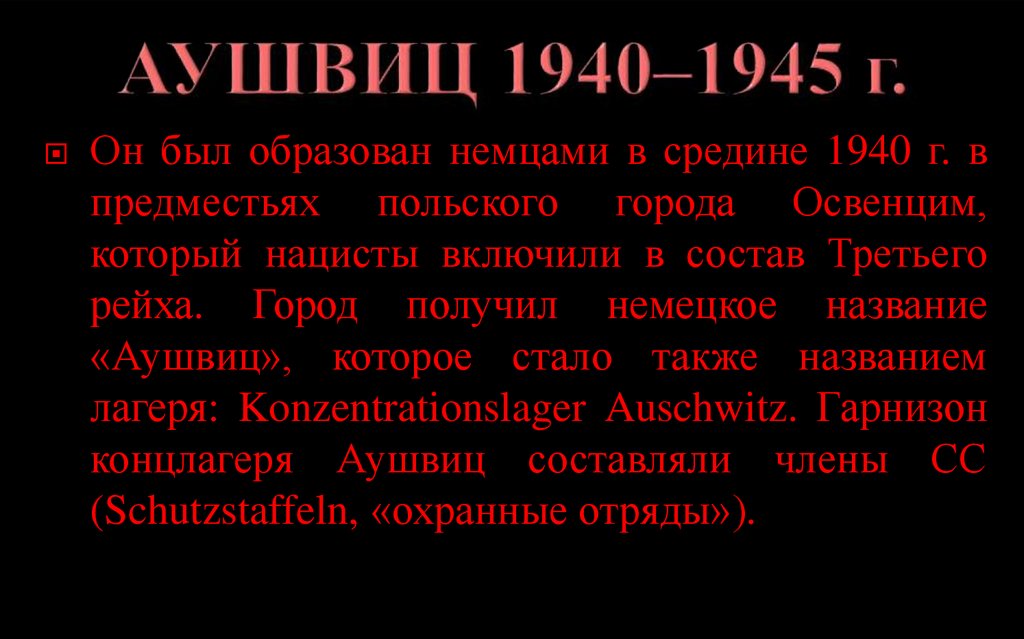 Он был образован немцами в средине 1940 г. впредместьях польского города Освенцим,