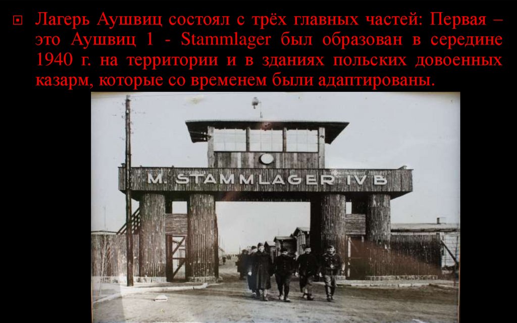Лагерь Аушвиц состоял с трёх главных частей: Первая –это Аушвиц 1 - Stammlager был образован в середине