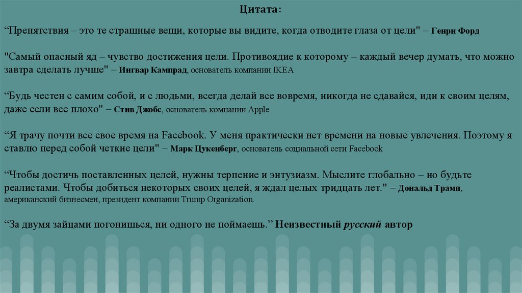 Цитата:“Препятствия – это те страшные вещи, которые вы видите, когда отводите глаза от цели" – Генри Форд