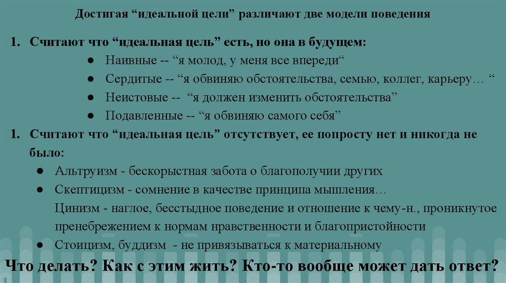 Достигая “идеальной цели” различают две модели поведения1. Считают что “идеальная цель” есть, но она в будущем: