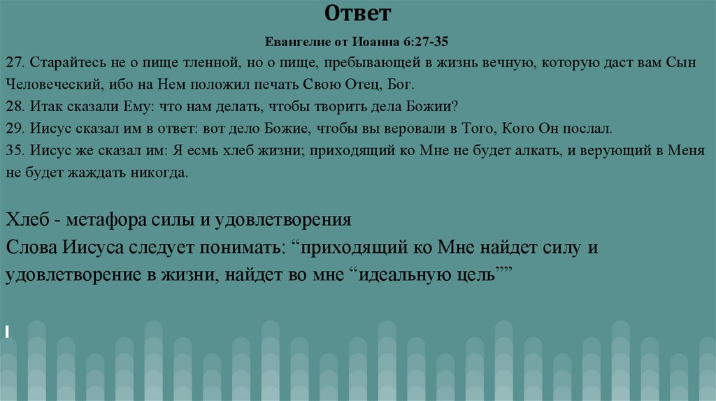 27. Старайтесь не о пище тленной, но о пище, пребывающей в жизнь вечную, которую даст вам Сын