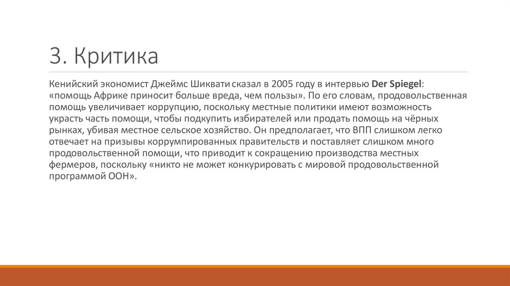 3. КритикаКенийский экономист Джеймс Шиквати сказал в 2005 году в интервью Der Spiegel: