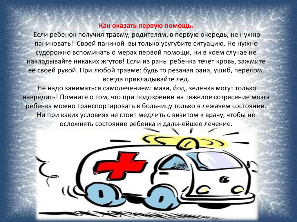 Как оказать первую помощь.Если ребенок получил травму, родителям, в первую очередь, не нужно