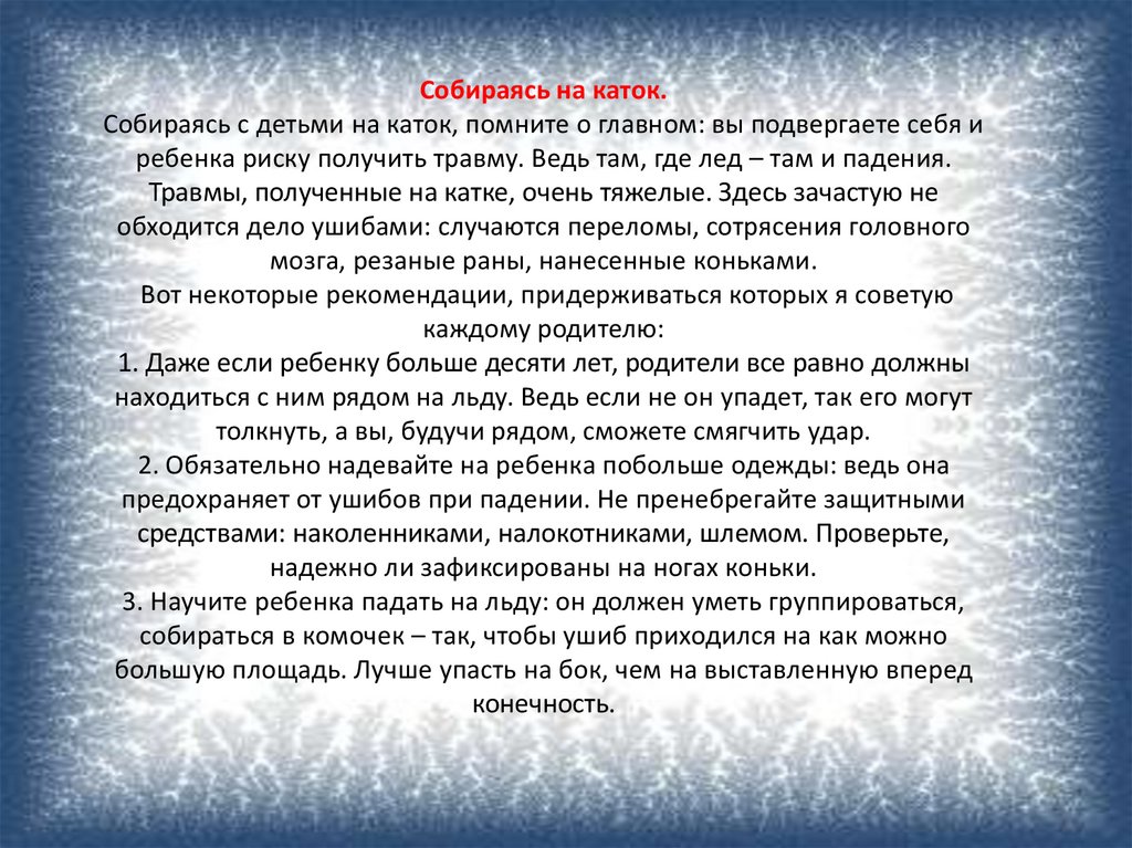 ребенка риску получить травму. Ведь там, где лед – там и падения.
