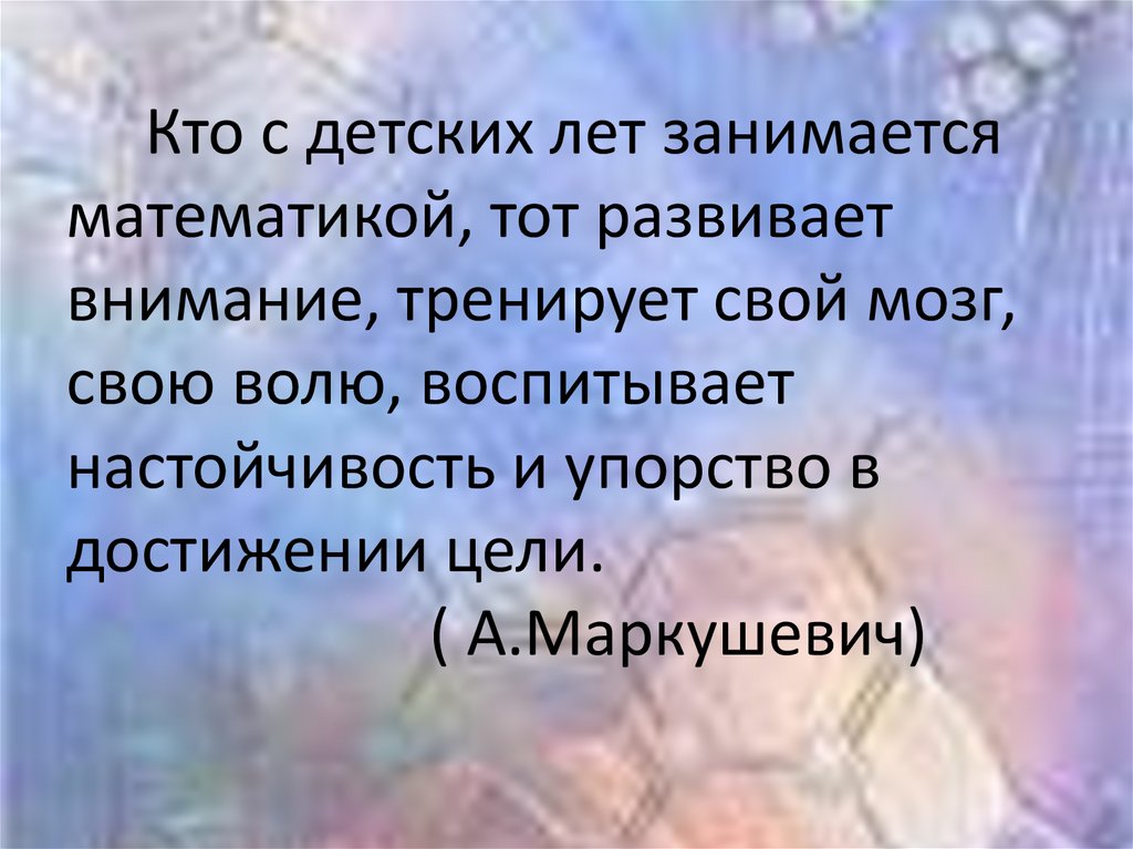Кто с детских лет занимаетсяматематикой, тот развивает