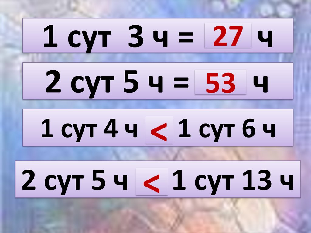1 сут 3 ч = 27 ч2 сут 5 ч = 53 ч