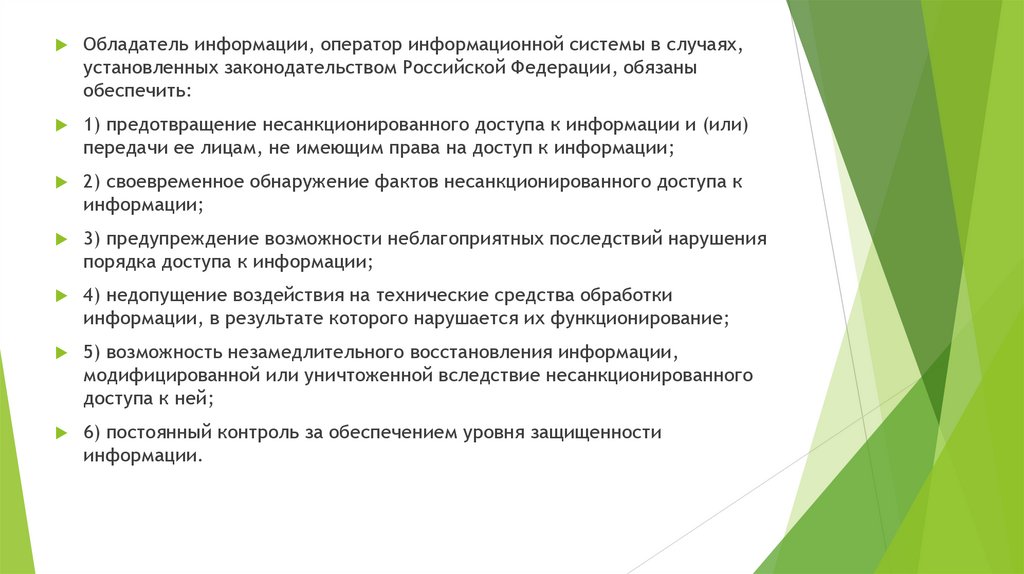 Обладатель информации, оператор информационной системы в случаях,установленных законодательством Российской Федерации, обязаны