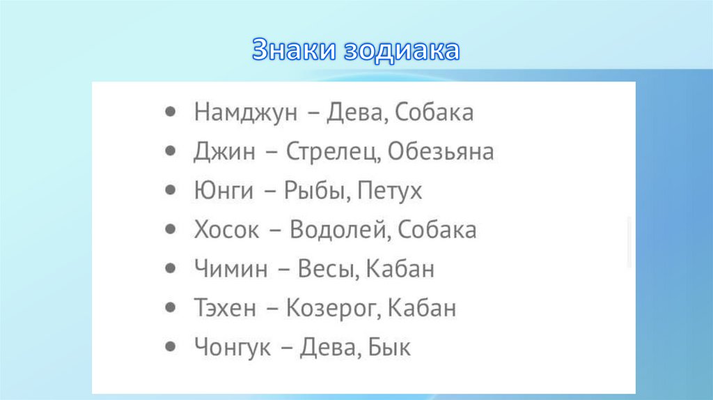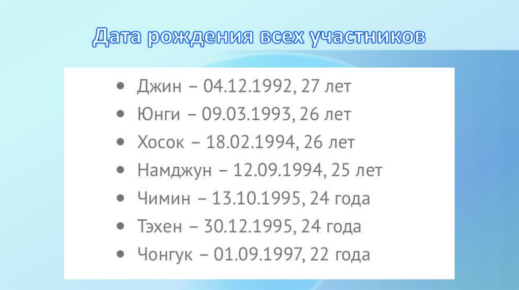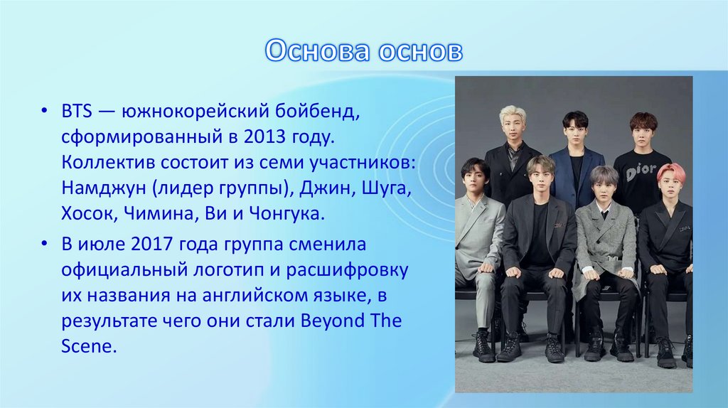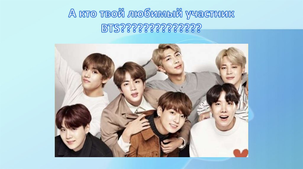 • BTS — южнокорейский бойбенд,сформированный в 2013 году.