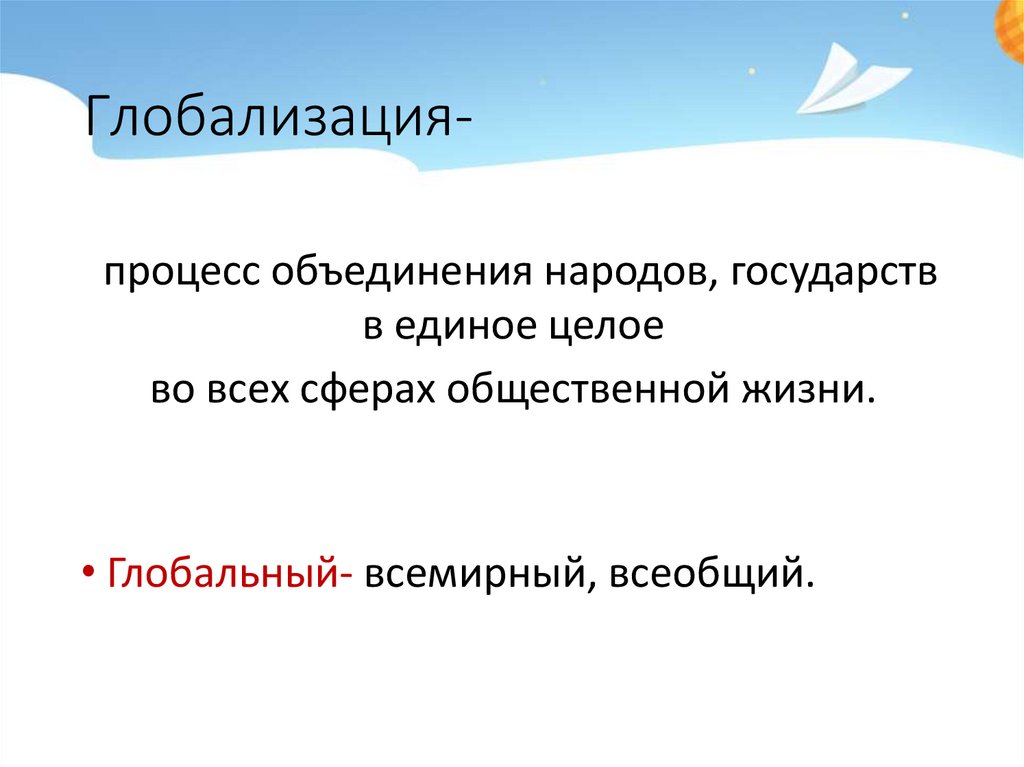 Глобализацияпроцесс объединения народов, государствв единое целое