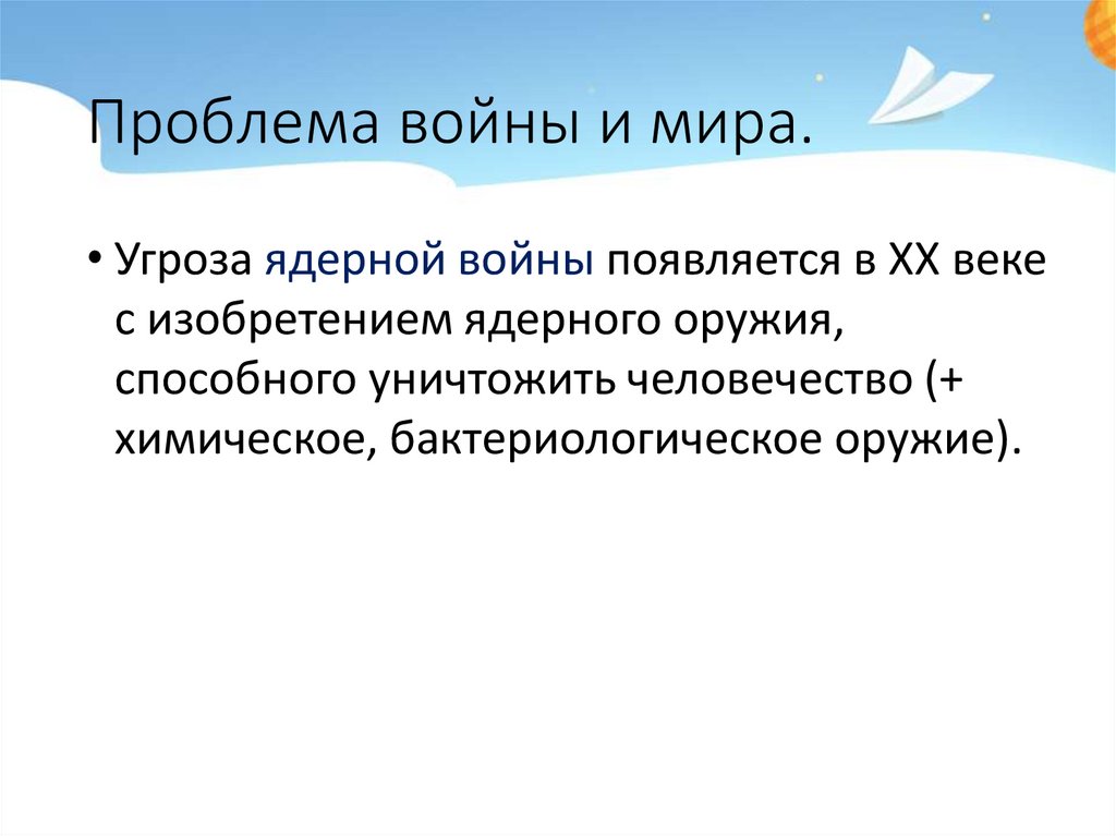 Проблема войны и мира.• Угроза ядерной войны появляется в XX веке