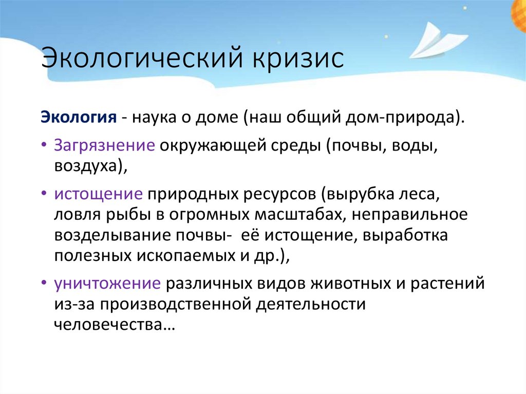 Экологический кризисЭкология - наука о доме (наш общий дом-природа).