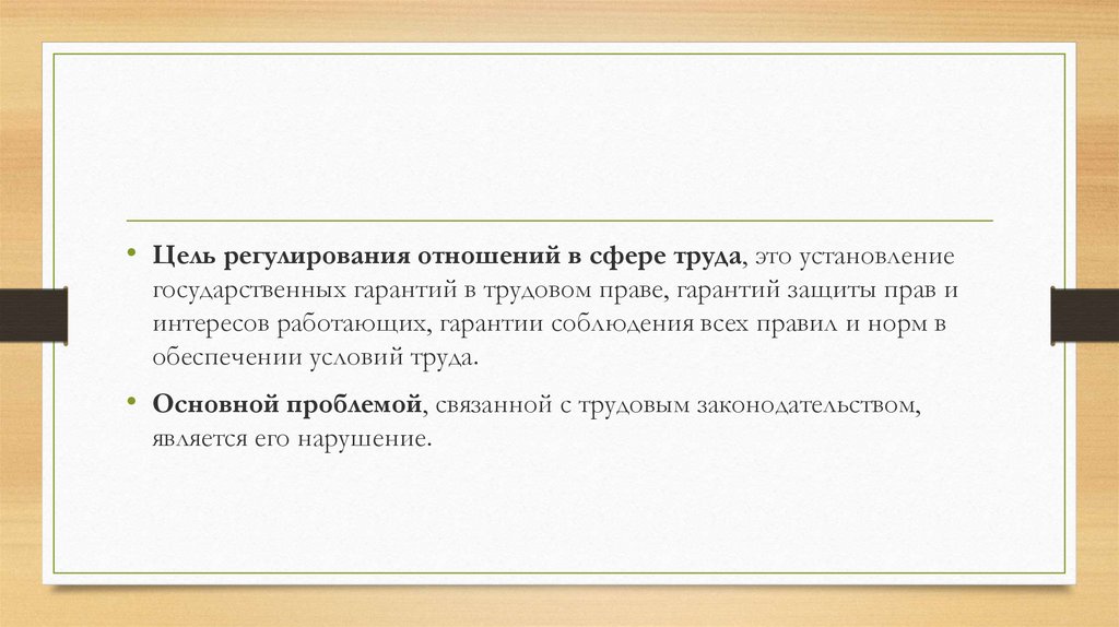 • Цель регулирования отношений в сфере труда, это установлениегосударственных гарантий в трудовом праве, гарантий защиты прав и