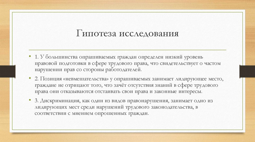 Гипотеза исследования• 1. У большинства опрашиваемых граждан определен низкий уровень
