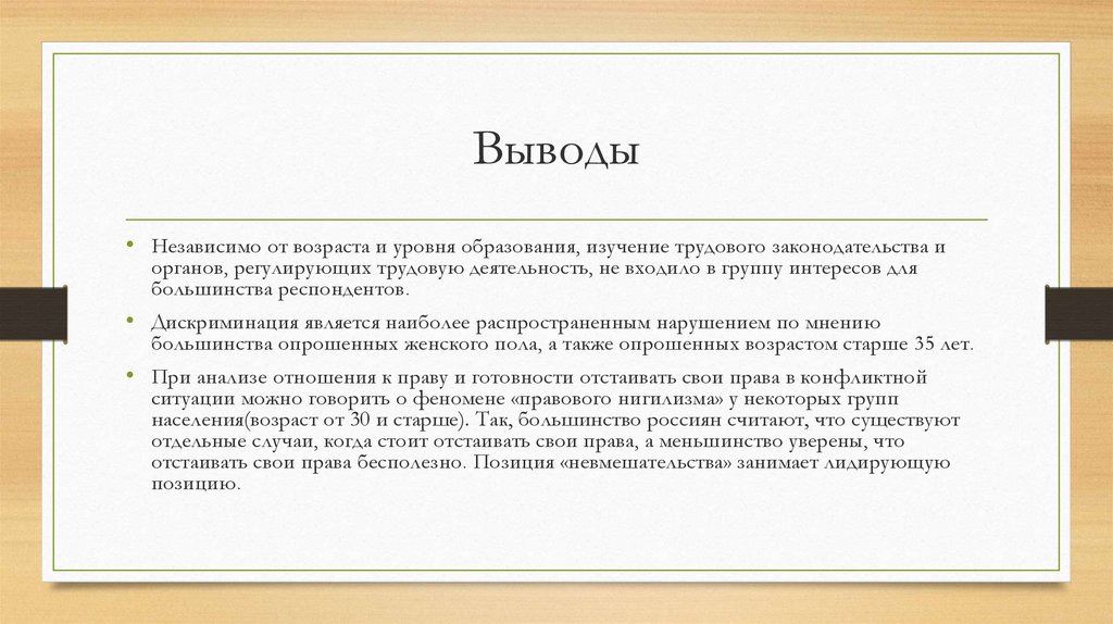 Выводы• Независимо от возраста и уровня образования, изучение трудового законодательства и