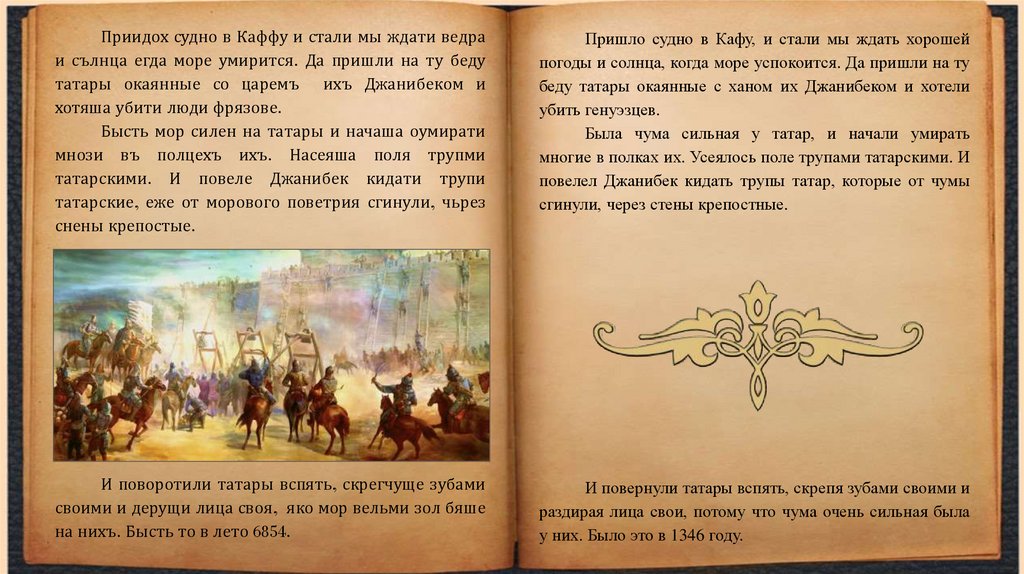 Приидох судно в Каффу и стали мы ждати ведраи сълнца егда море умирится. Да пришли на ту беду