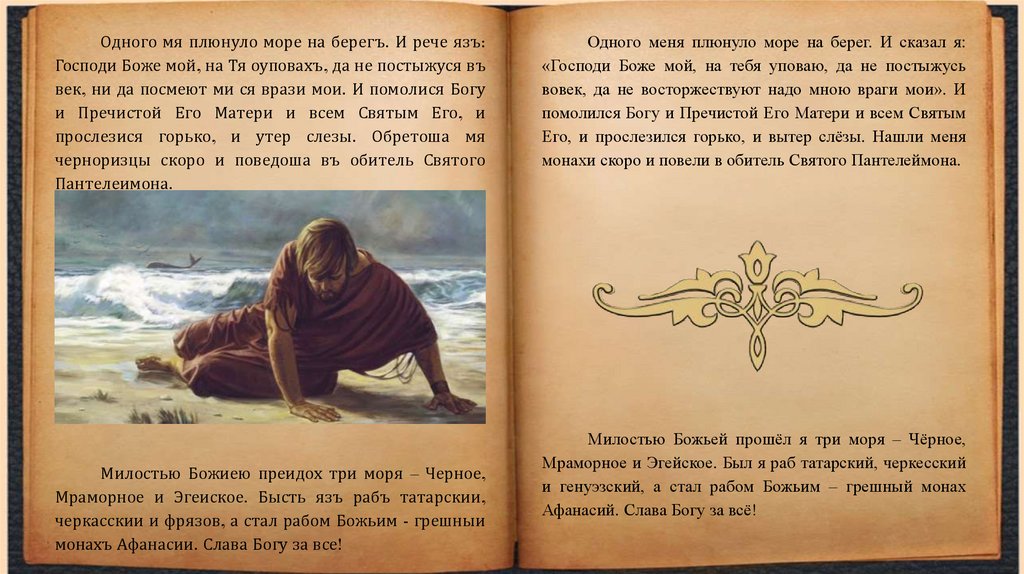 Одного мя плюнуло море на берегъ. И рече язъ:Господи Боже мой, на Тя оуповахъ, да не постыжуся въ