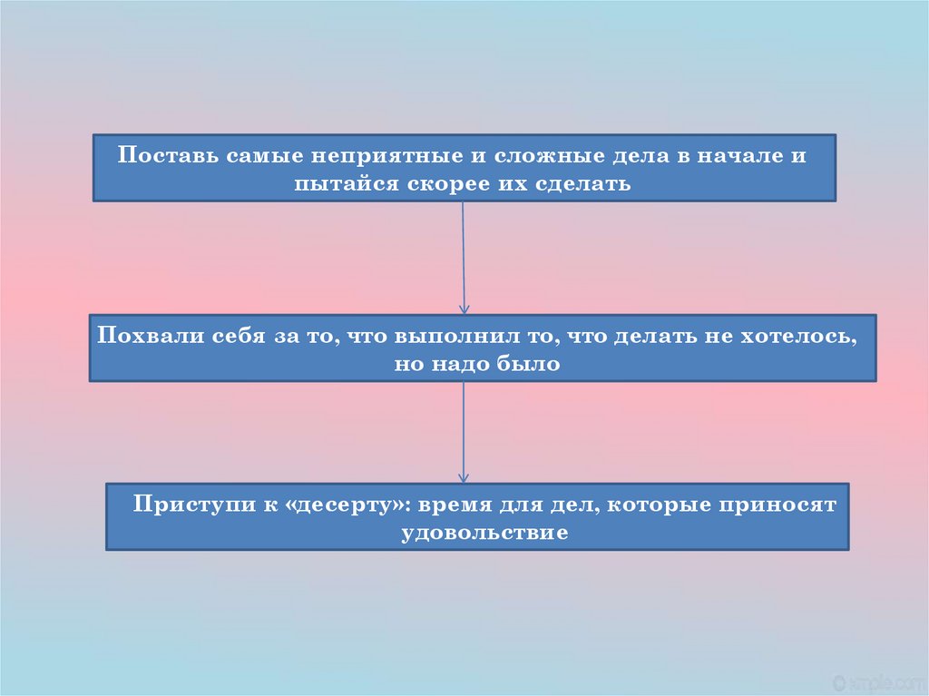 Поставь самые неприятные и сложные дела в начале ипытайся скорее их сделать