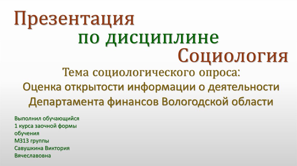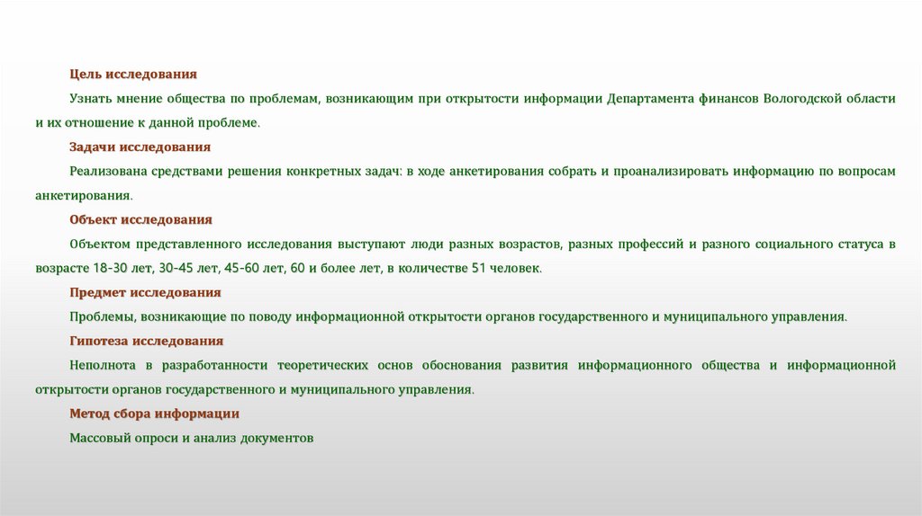 Цель исследованияУзнать мнение общества по проблемам, возникающим при открытости информации Департамента финансов Вологодской области