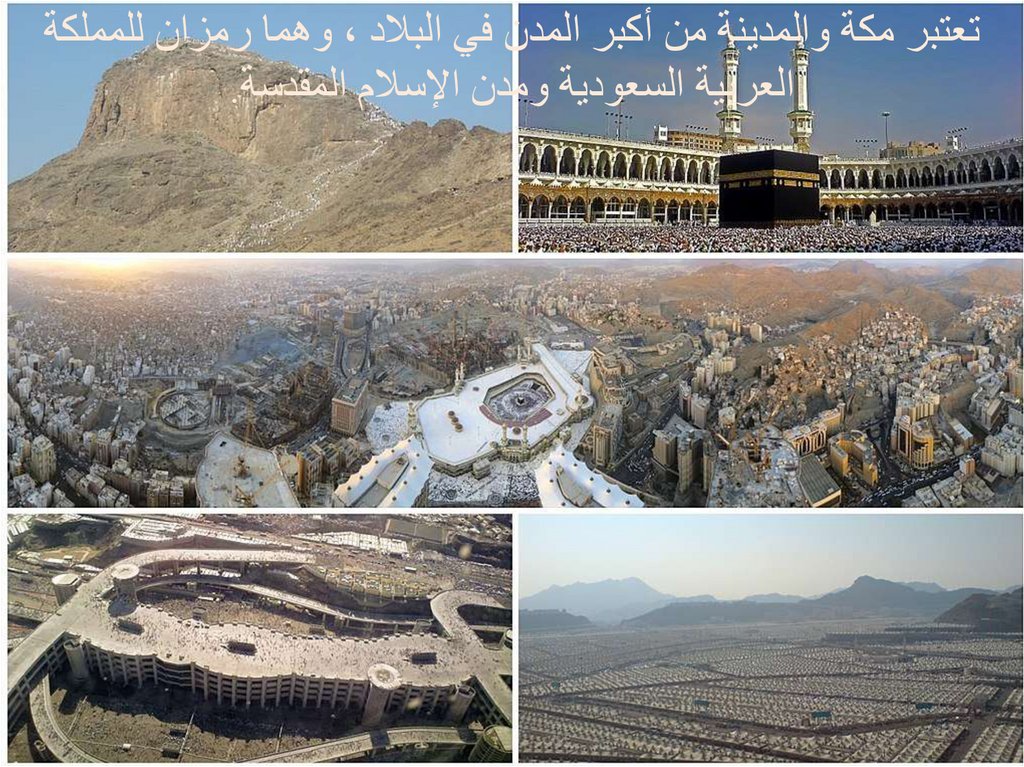 تعتبر مكة والمدينة من أكبر المدن في البالد ،وهما رمزان للمملكةالعربية السعودية ومدن اإلسالم المقدسة.