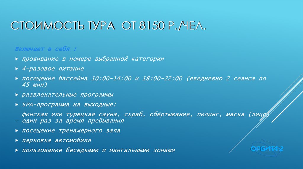 СТОИМОСТЬ ТУРА ОТ 8150 Р./ЧЕЛ.Включает в себя :