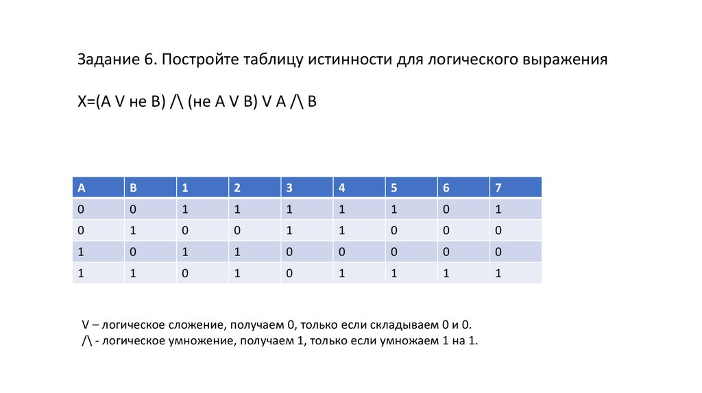 Задание 6. Постройте таблицу истинности для логического выраженияX=(A V не В) /\ (не А V В) V А /\ В