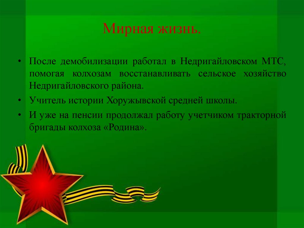 Мирная жизнь.• После демобилизации работал в Недригайловском МТС,