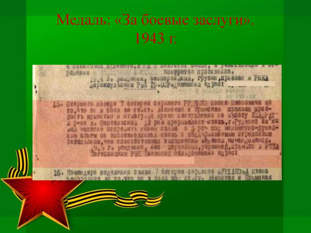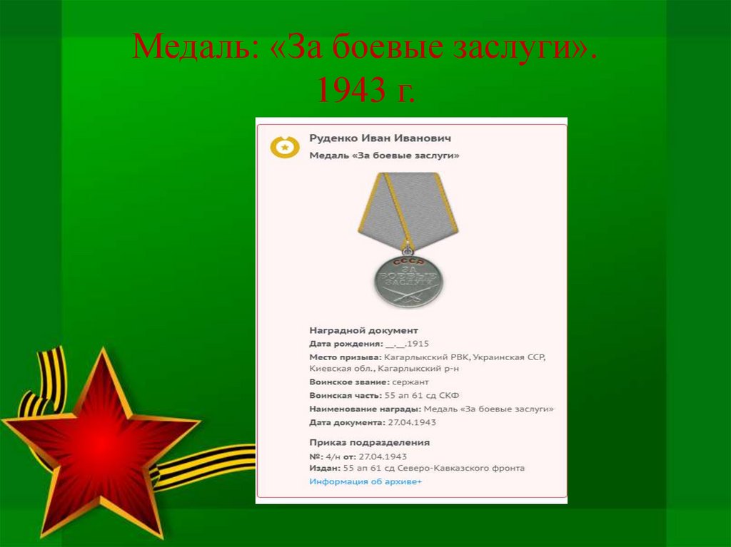 Медаль: «За боевые заслуги».1943 г.