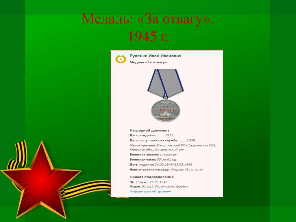 Медаль: «За отвагу».1945 г.