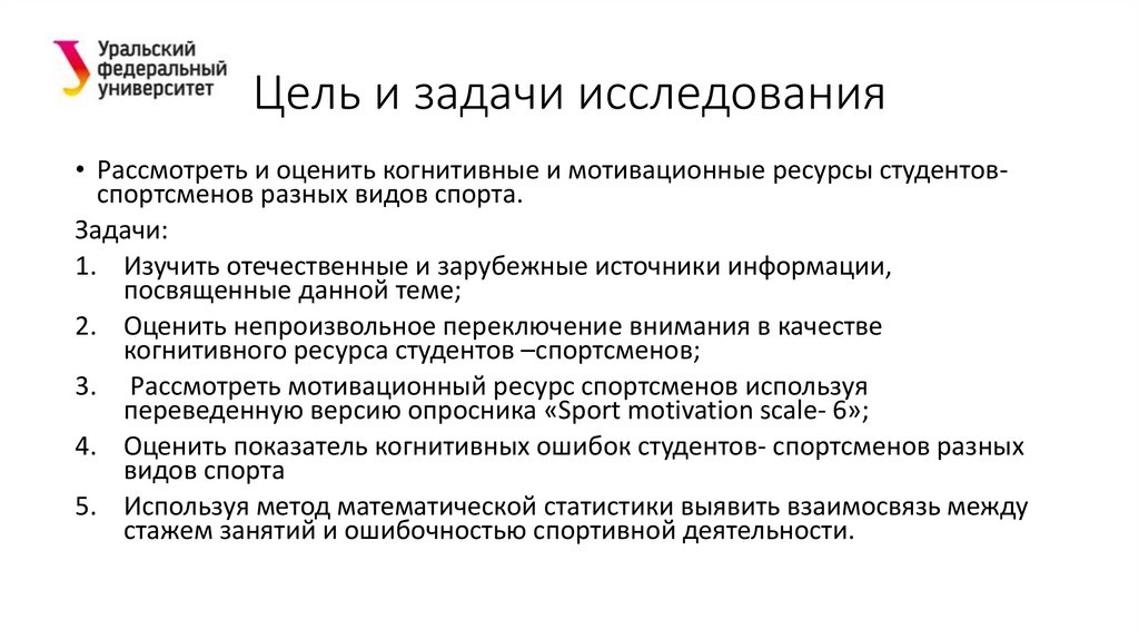 Цель и задачи исследования• Рассмотреть и оценить когнитивные и мотивационные ресурсы студентовспортсменов разных видов спорта.