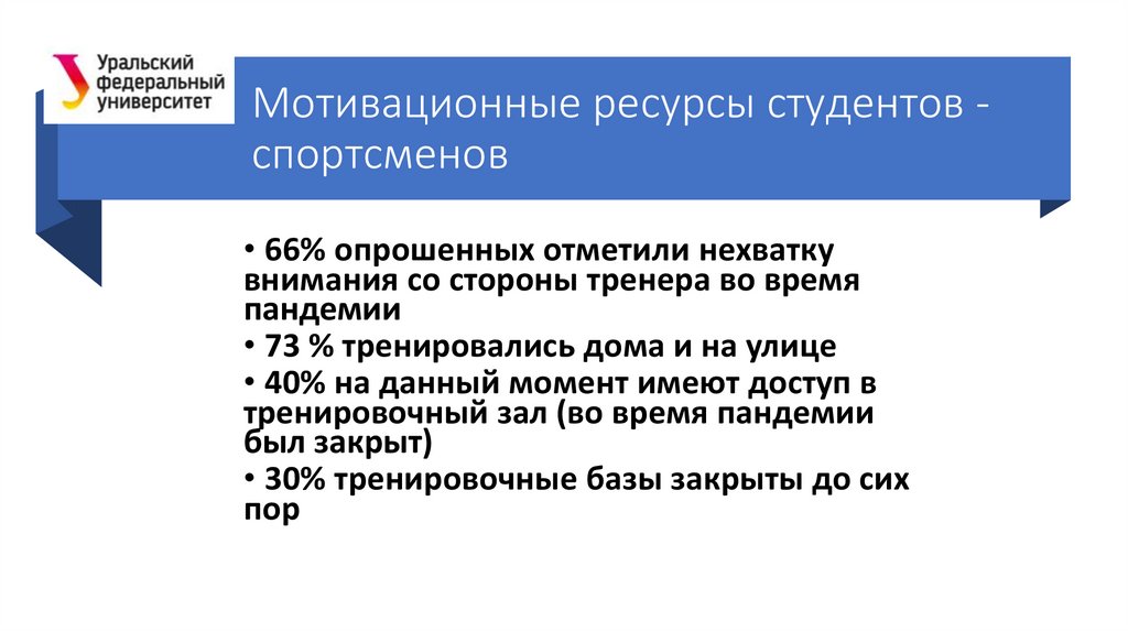 Мотивационные ресурсы студентов спортсменов• 66% опрошенных отметили нехватку