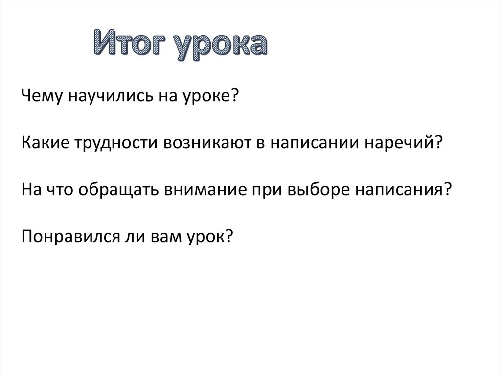 Чему научились на уроке?Какие трудности возникают в написании наречий?