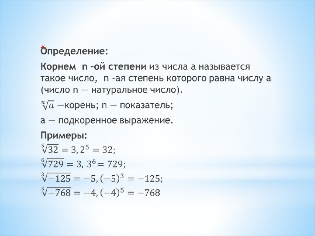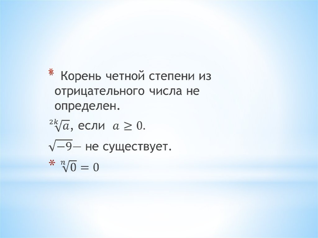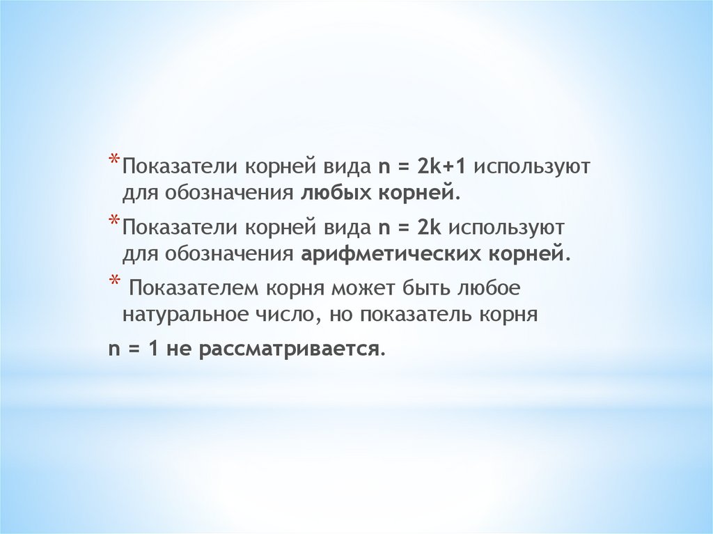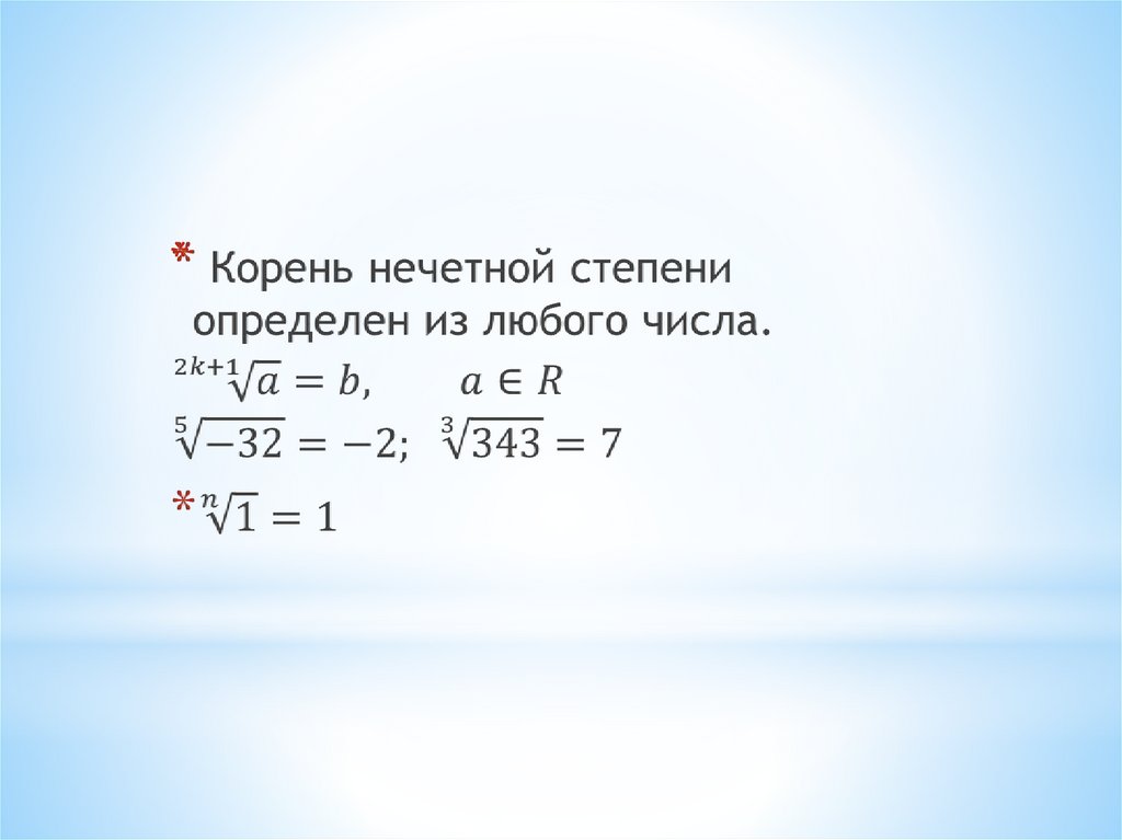 * Показатели корней вида n = 2k+1 используютдля обозначения любых корней.