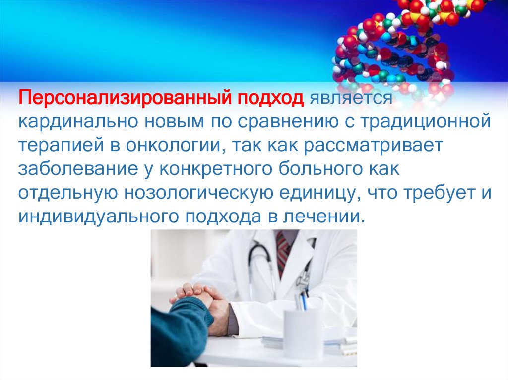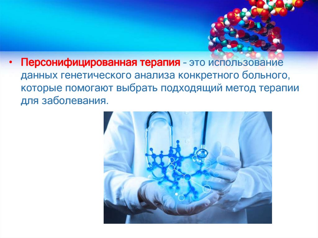 • Персонифицированная терапия – это использованиеданных генетического анализа конкретного больного,