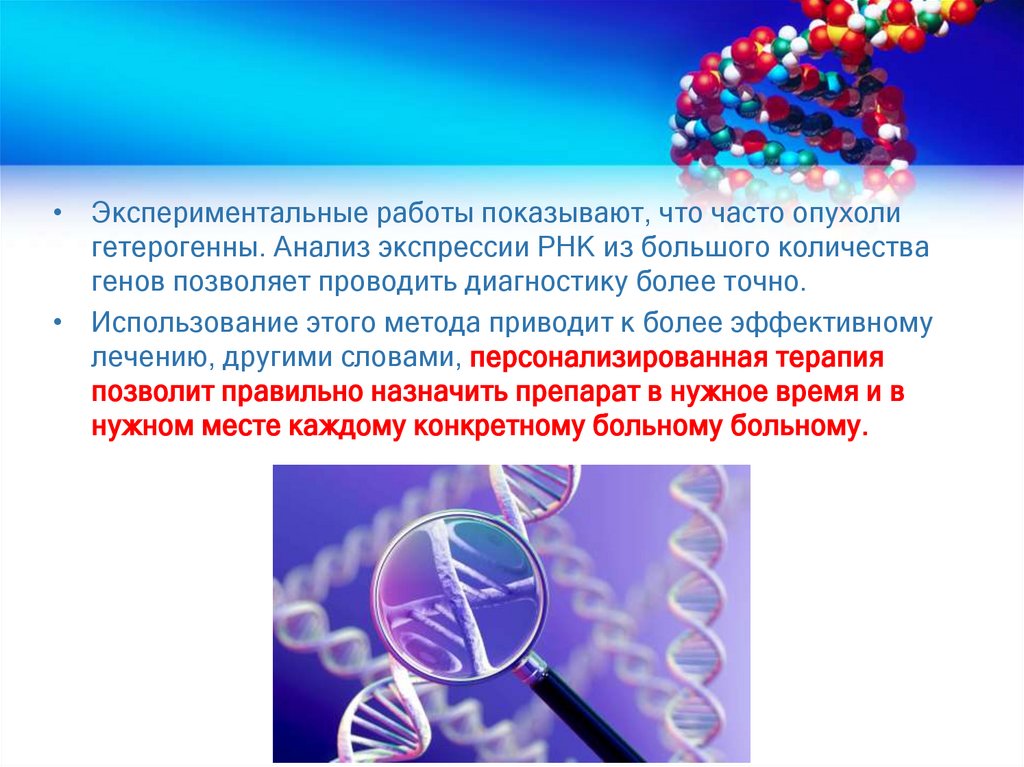 • Экспериментальные работы показывают, что часто опухолигетерогенны. Анализ экспрессии РНК из большого количества
