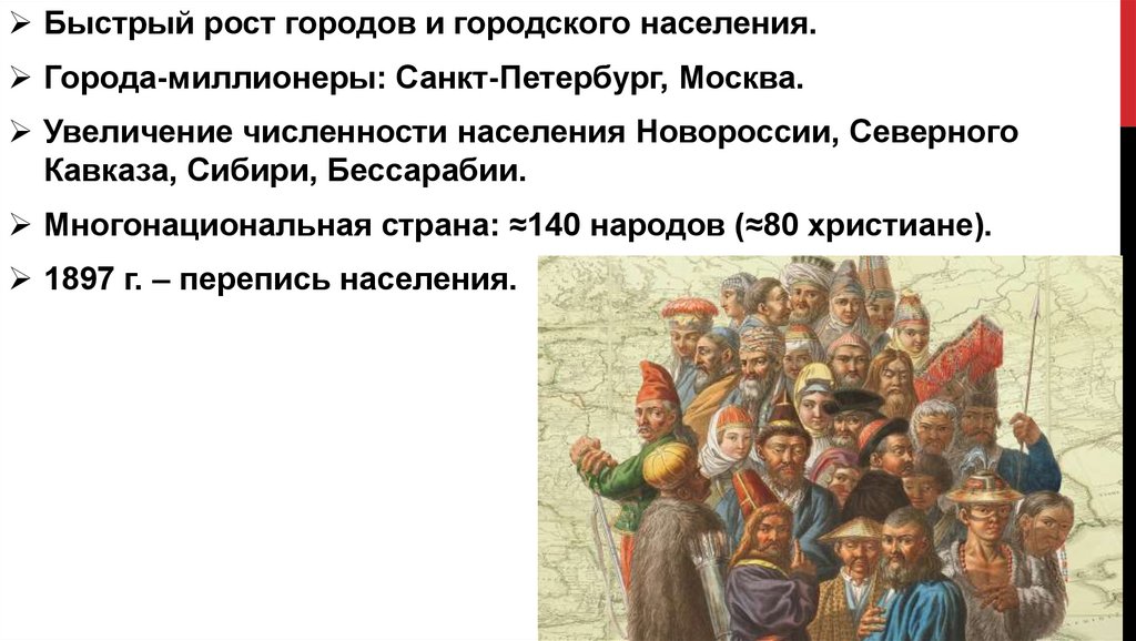 Быстрый рост городов и городского населения.Города-миллионеры: Санкт-Петербург, Москва.
